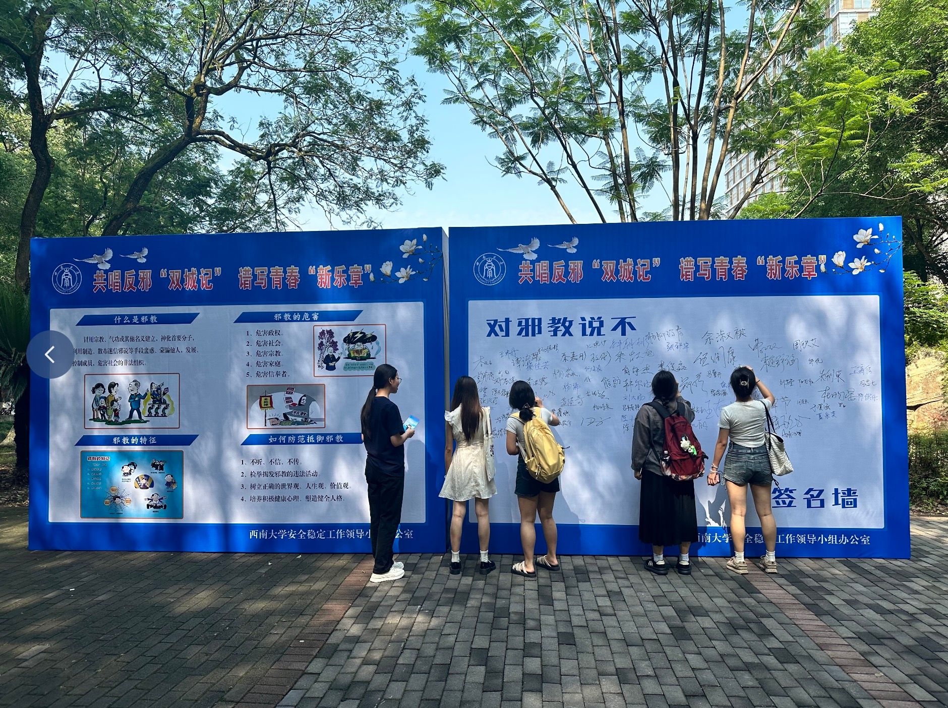 反邪教签名活动。6月12日上午,学校保卫处组织开展了“对邪教说不”线下签名活动。现场工作人员向参与活动的师生详细讲解了反邪教相关知识,同学们在反邪教签名墙上,以签名为承诺,以反对邪教为己任,自觉远离邪教,坚决做到不听、不信、不传、不参与。活动现场气氛浓厚,吸引了近千名师生积极参与,纷纷表示要做校园反邪卫士。